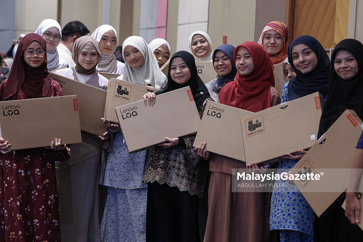 Para pelajar cemerlang melihat komputer riba yang diterima mereka pada Majlis Anugerah Kecemerlangan Pelajar Biasiswa dan Dermasiswa Profesional MAIPk Tahun 2025 di Hotel Casuarina Meru, Ipoh. Foto ABDULLAH YUSOF, 28 NOVEMBER 2025.