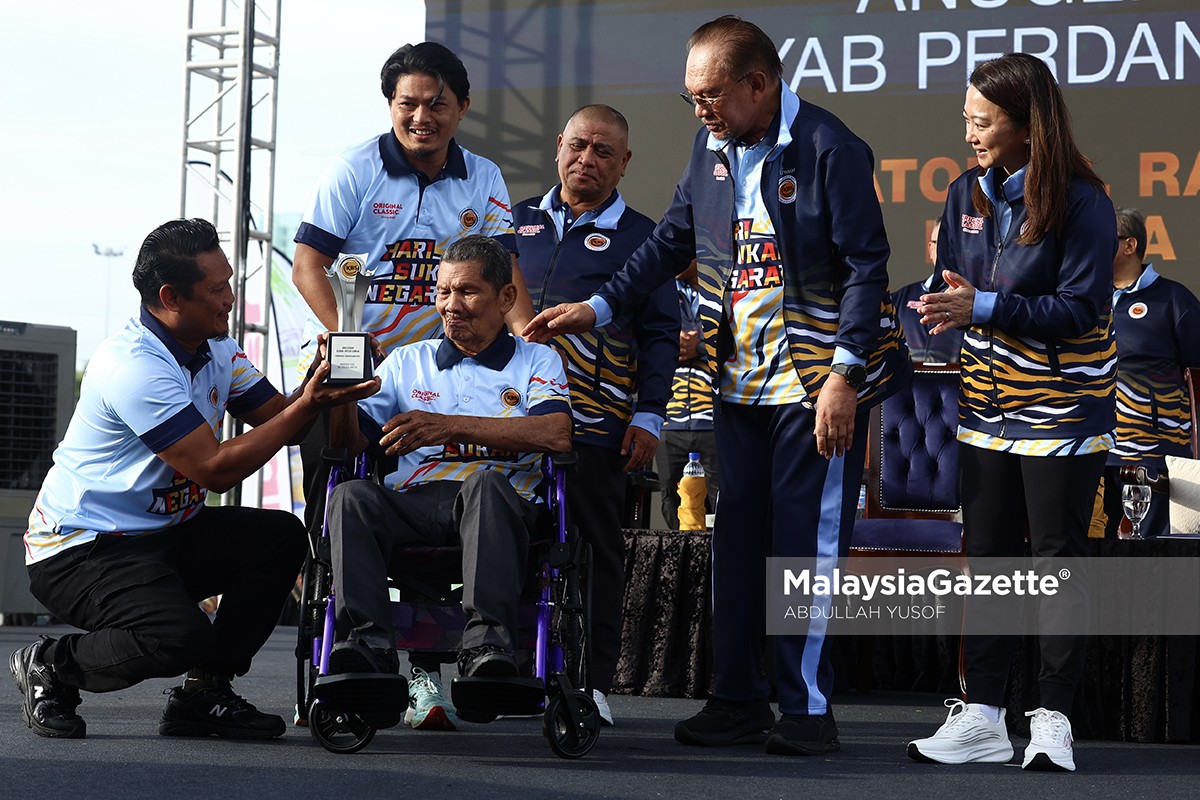 Perdana Menteri, Datuk Seri Anwar Ibrahim menyampaikan Anugerah Sukan Untuk Semua kategori Anugerah Khas Perdana Menteri pada Perasmian Sambutan Hari Sukan Negara Peringkat Kebangsaan 2025 di Bulatan Sultan Azlan Shah, Meru, Ipoh. Foto ABDULLAH YUSOF, 11 OKTOBER 2025.