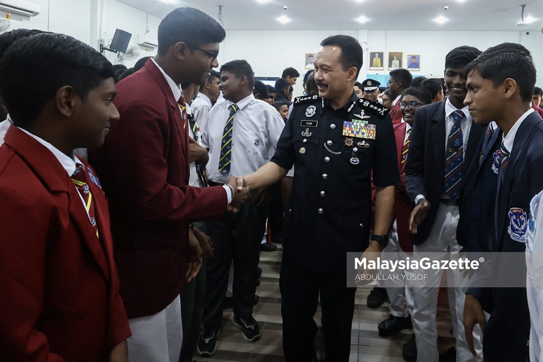 Ketua Polis Perak, Datuk Seri Mohd Yusri Hassan Basri bergambar bersama pelajar sekolah pada majlis perasmian Program Pencegahan Jenayah Dan Meniti Kerjaya Dalam PDRM, anjuran Jabatan Pencegahan Jenayah Dan Keselamatan Komuniti (JPJKK) PDRM Perak, di Sekolah Menengah Kebangsaan Sungai Pari. Foto ABDULLAH YUSOF, 30 OCTOBER 2023