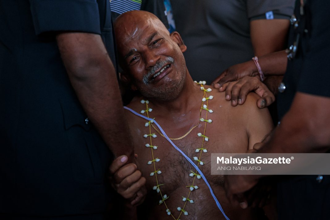 M Sugunanathan, 68, tidak dapat menahan sebak dan kelihatan lemah sehingga terpaksa ditenangkan serta dipapah anggota keluarga sepanjang upacara itu berlangsung.