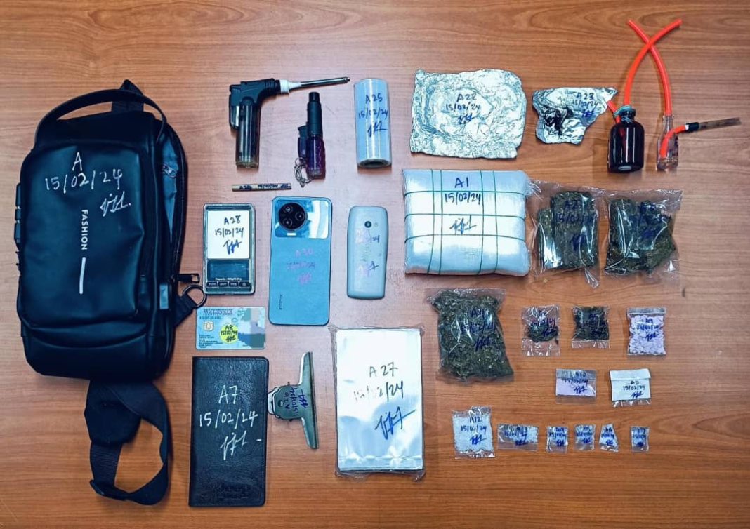 “Pihak polis telah menjumpai satu bungkusan plastik berbalut dan berikat getah berisi ketulan mampat daun kering disyaki dadah jenis ganja dan lima paket plastik lutsinar berisi dadah yang sama dianggarkan seberat 708.5 gram.