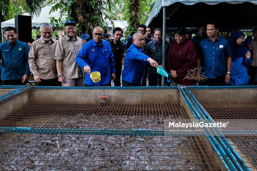 Menteri Besar Perak, Datuk Seri Saarani Mohamad memberi makanan kepada ikan baung ketika hadir ke Majlis Penyerahan Jeti Nelayan Darat dan Pelepasan Benih Ikan ke Perairan Umum di Kampung Sungai Ranggas, Tapah Road, pada Jumaat. Foto ANIQ NABILAFIQ ANUAR.
