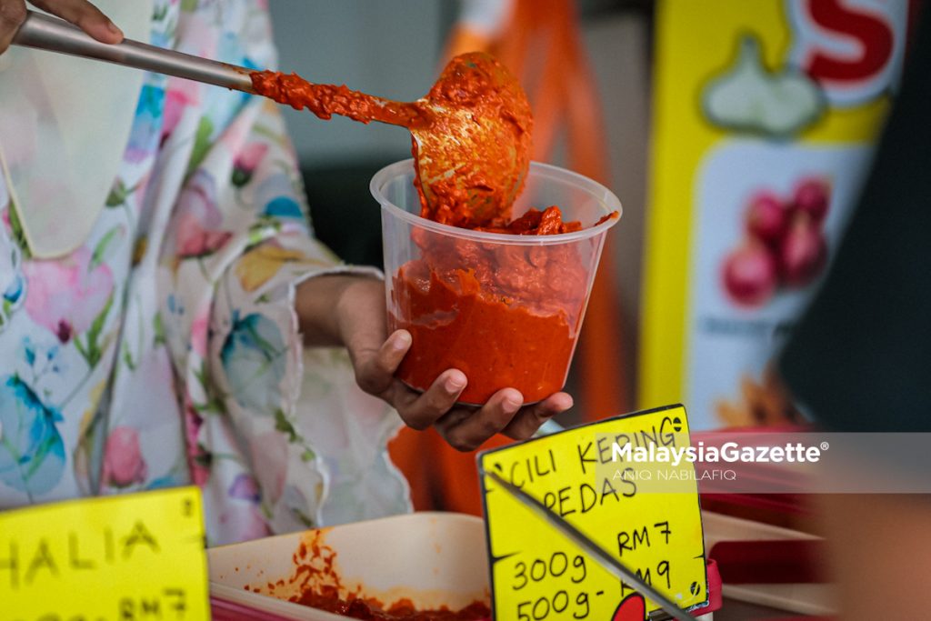 Pengusaha TheMakcikBawang, Mashitah Muhamad Basir, 28, menyediakan pesanan bahan kisar cili kering untuk pelanggannya ketika tinjauan lensa MalaysiaGazette (MG) Perak di Pasar Awam Sitiawan, Manjung. Foto ANIQ NABILAFIQ ANUAR, 26 FEBRUARI 2026.