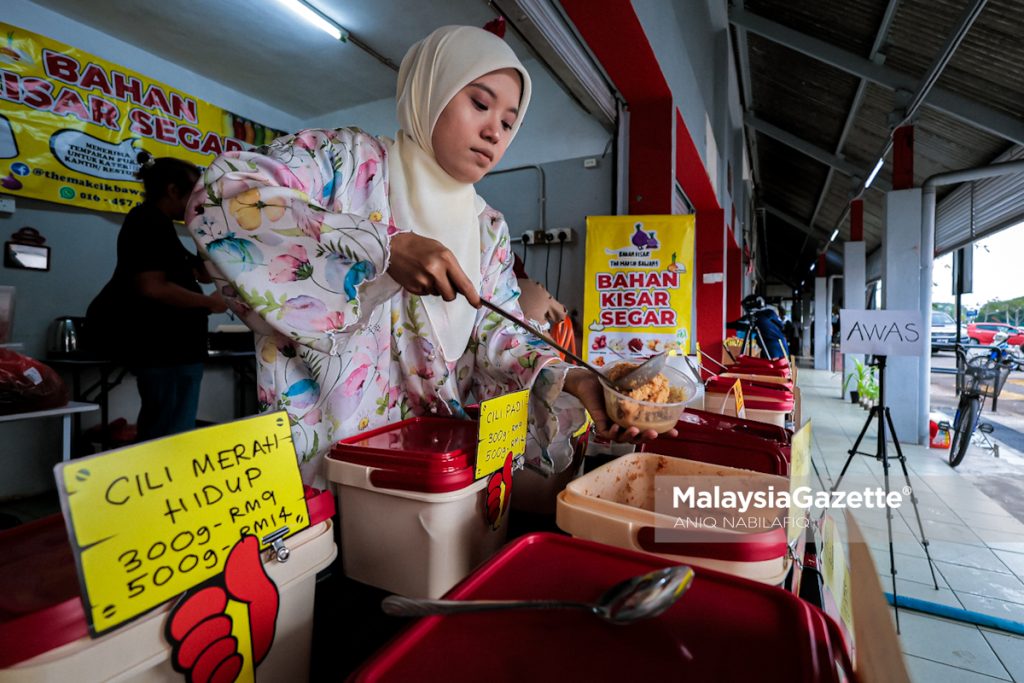 Pengusaha TheMakcikBawang, Mashitah Muhamad Basir, 28, menyediakan pesanan bahan kisar segar untuk pelanggannya ketika tinjauan lensa MalaysiaGazette (MG) Perak di Pasar Awam Sitiawan, Manjung. Foto ANIQ NABILAFIQ ANUAR, 26 FEBRUARI 2026.