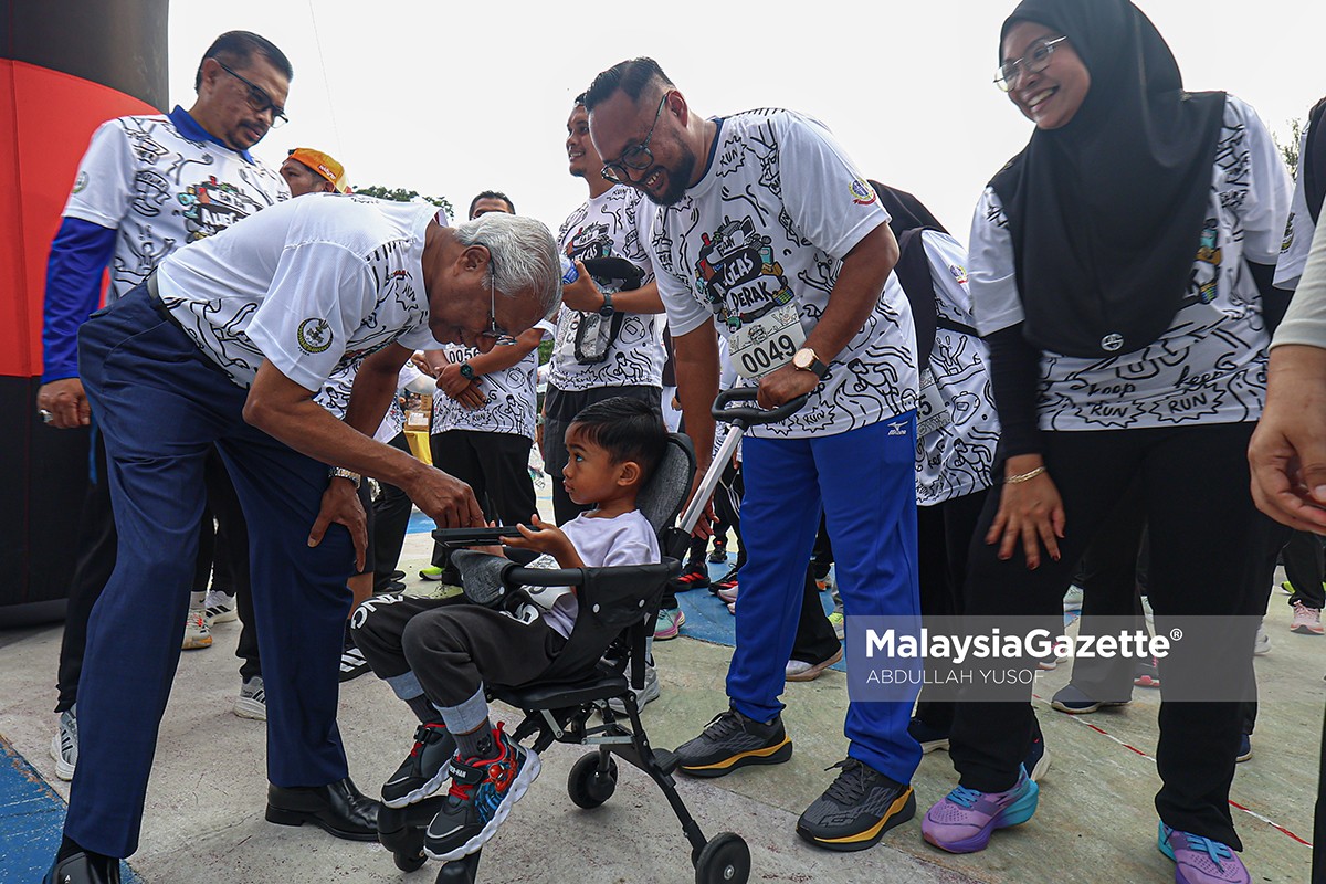 Exco Sumber Manusia, Kesihatan, Hal Ehwal Masyarakat India dan Integrasi Nasional Perak, A Sivanesan menyantuni kanak-kanak ketika hadir pada Program Fun Run AUEGCAS Perak di Padang Rekreasi Sultan Abdul Aziz (Padang Polo), Ipoh. Foto ABDULLAH YUSOF, 18 OKTOBER 2025.