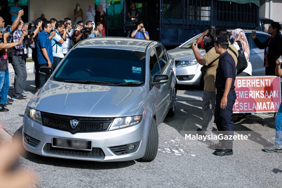 Kira-kira 10 minit kemudian tertuduh keluar dari kamar mahkamah dengan diselubungi kain sama sebelum di bawa keluar menaiki enam kenderaan yang melalui perkarangan mahkamah.