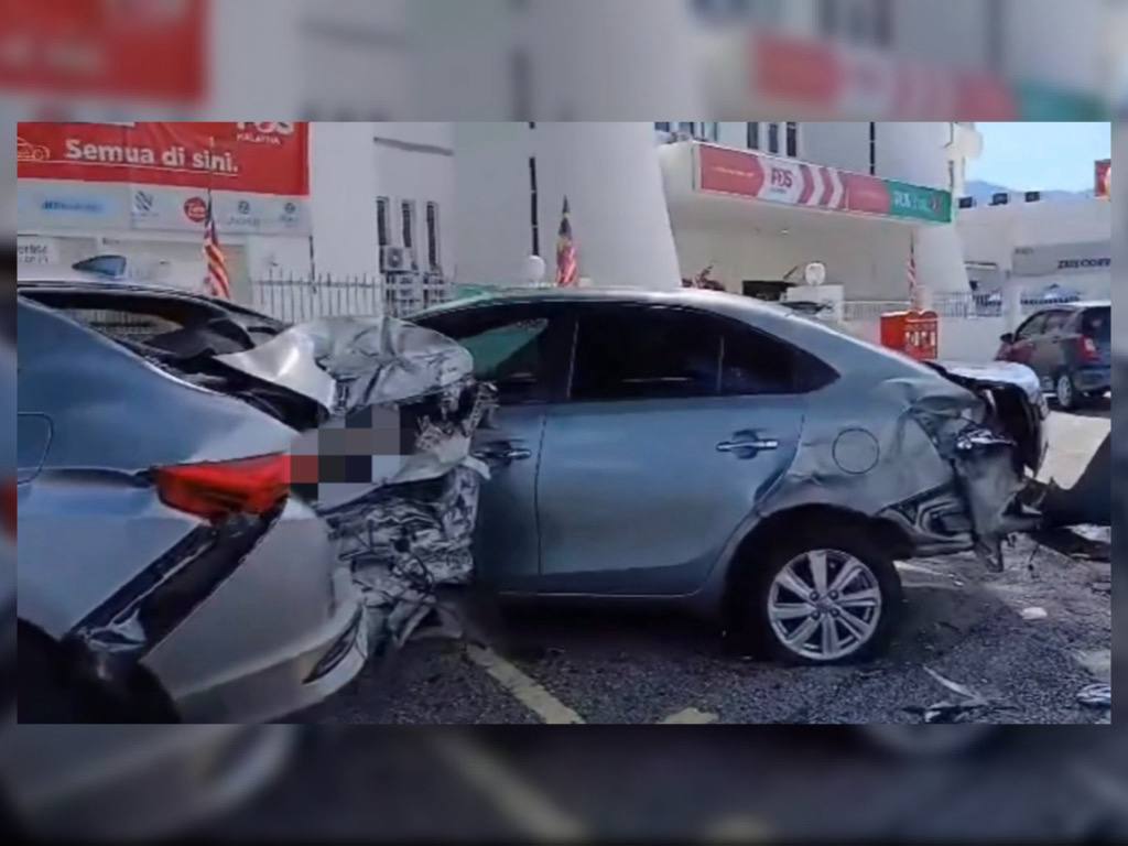 Menerusi video berkenaan, beberapa kereta antaranya jenis Honda, Toyota dan Proton dilihat mengalami kerosakan teruk pada bahagian belakang, termasuk cermin dan bampar. – MG Perak