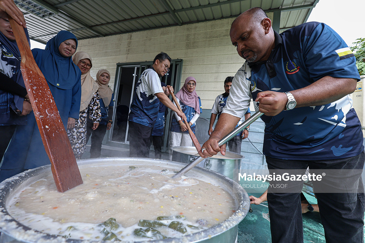 Setiausaha Agung Gabungan Kesatuan Pekerja-Pekerja Dalam Perkhidmatan-Perkhidmatan Kerani dan Bersekutu Kerajaan (AUEGCAS), Amir Hamzah Yakat Ali (kanan) mengacau bubur lambuk pada Program Bubur Lambuk AUEGCAS Perak di Ipoh. Foto ABDULLAH YUSOF 09 MARCH 2026.