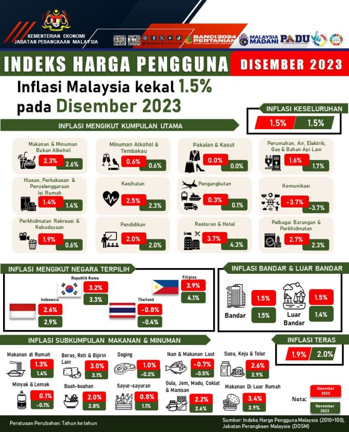 KUALA LUMPUR – Kadar inflasi keseluruhan Malaysia kekal 1.5 peratus pada Disember 2023 dengan mata indeks mencatatkan 131.2 berbanding 129.2 pada bulan yang sama tahun sebelumnya.