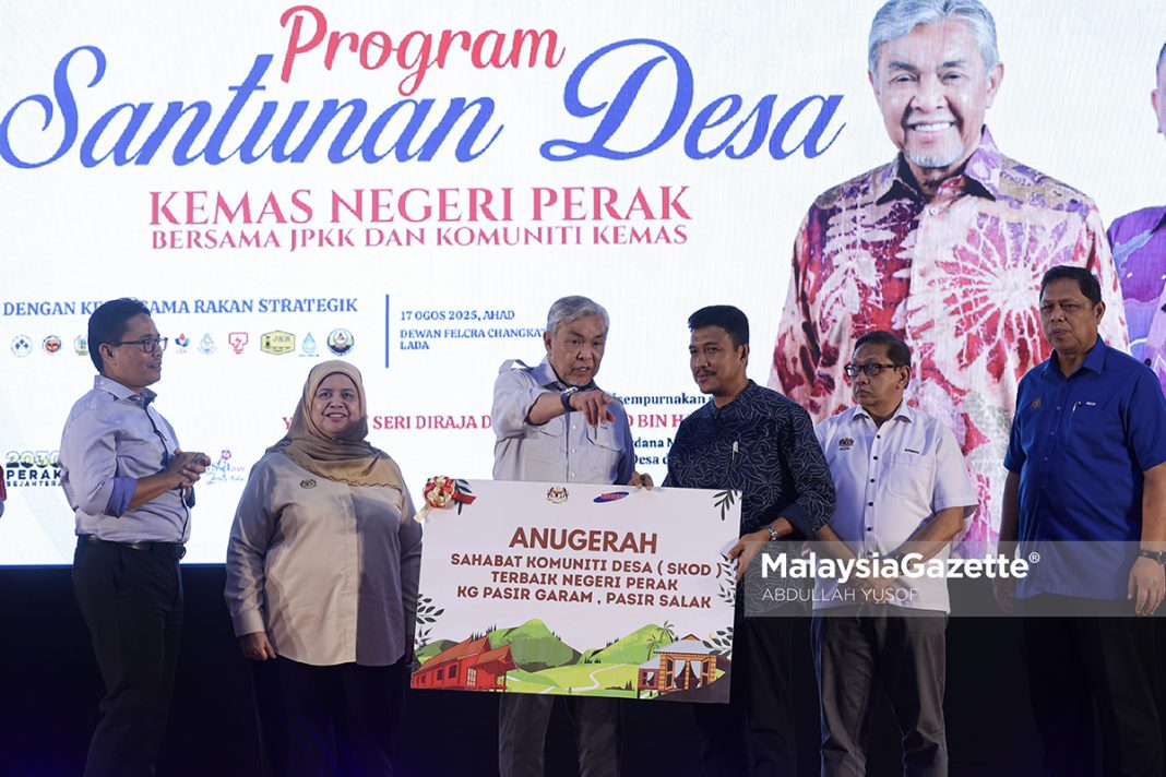 Terdahulu Ahmad Zahid hadir ke Program Santunan Desa Kemas Negeri Perak Bersama JPKK Dan Komuniti Kemas di Dewan Besar Bandar Baru Felcra Seberang Perak, di sini.