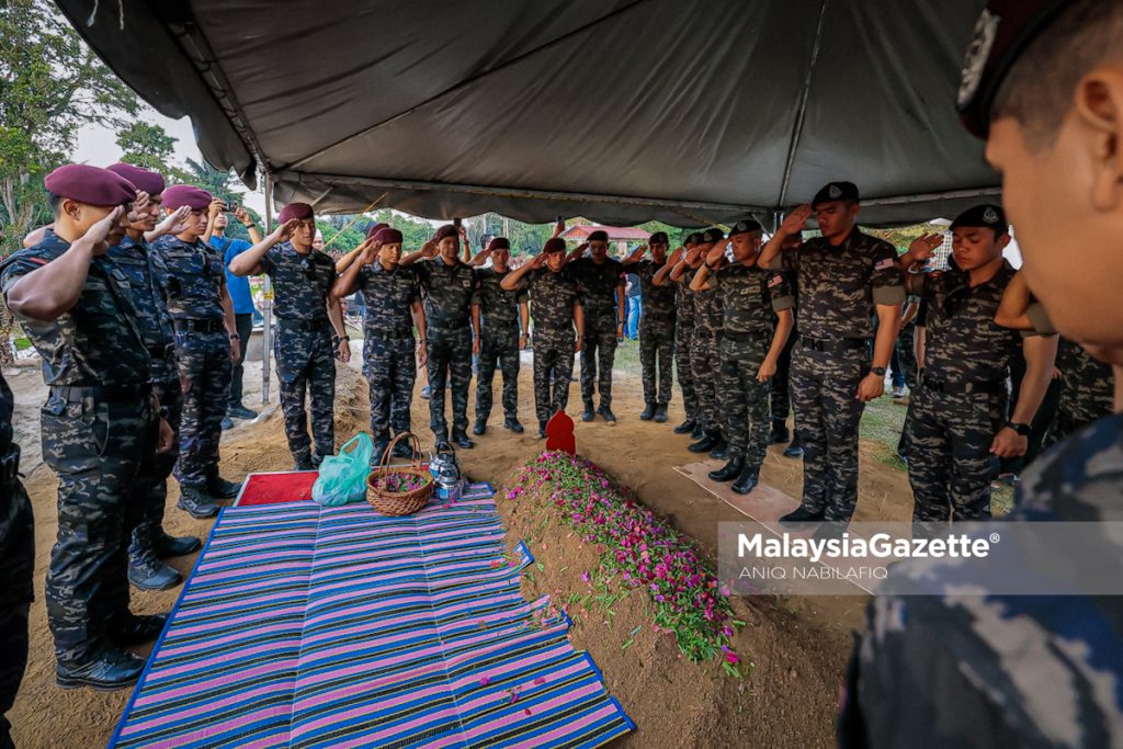 IPOH – Jenazah Pegawai Kanan VAT 69 Komando, Allahyarham Inspektor Khairil Azhar Kamaruddin yang meninggal dunia ketika menjalani latihan menyelam di Pulau Mataking, Semporna, selamat dikebumikan pada jam 6.10 petang, di sini pada Jumaat
