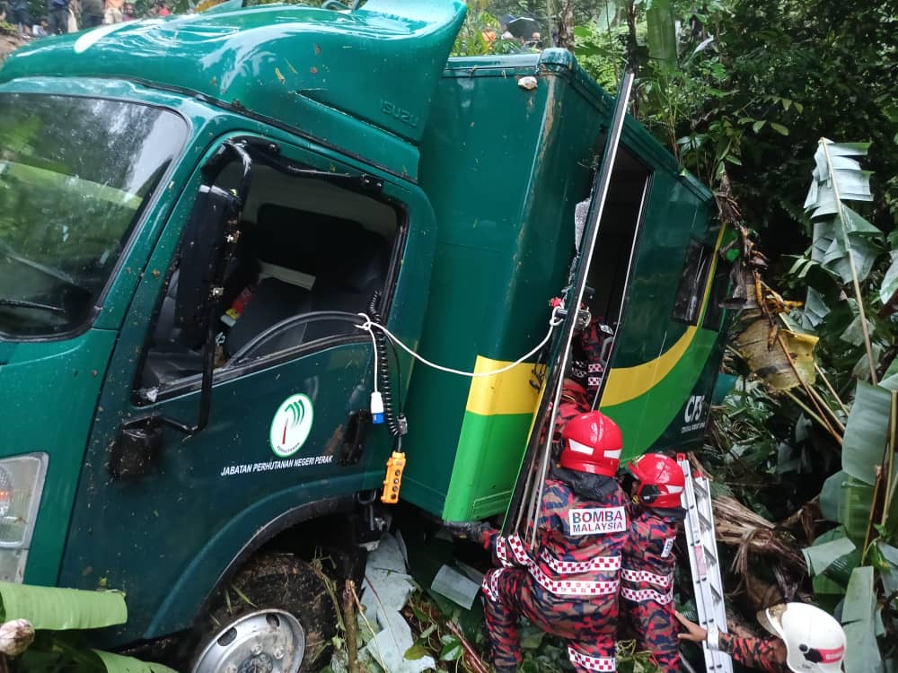 TAPAH – 12 kakitangan Jabatan Perhutanan Negeri Perak dan malim gunung cedera selepas lori yang dinaiki mereka terbabas sebelum terjatuh ke dalam gaung sedalam kira-kira lima meter di Jalan Gunung Batu Putih- Hutan Lipur Kuala Woh, dekat sini, pada Ahad.