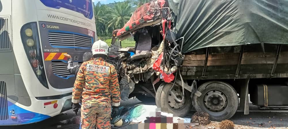 “Maklumat awal mendapati, kejadian berlaku apabila lori muatan sawit dinaiki mangsa bersama dua yang lain melanggar bahagian belakang sebuah bas membawa enam penumpang.