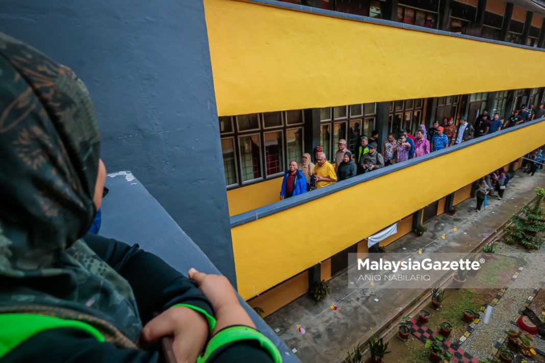 Menteri Besar Perak, Datuk Seri Saarani Mohamad menyantuni mangsa banjir di Pusat Pemindahan Sementara (PPS) Sekolah Kebangsaaan (SK) Layang-Layang Kiri, Parit, pada Khamis. Foto ANIQ NABILAFIQ ANUAR, 26 NOVEMBER 2025.
