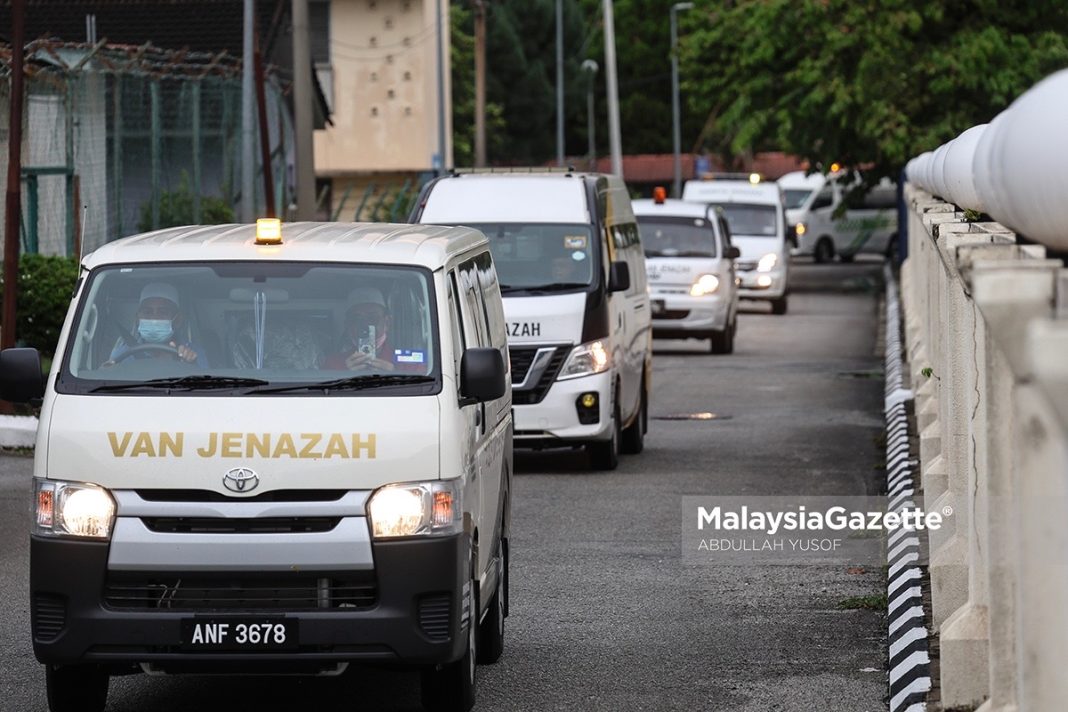 IPOH – 10 van jenazah termasuk dua ambulans yang membawa kesemua mangsa nahas dua helikopter Tentera Laut Diraja Malaysia (TLDM) pagi tadi tiba di perkarangan Jabatan Forensik Hospital Raja Permaisuri Bainun (HRPB), di sini, pada Selasa.