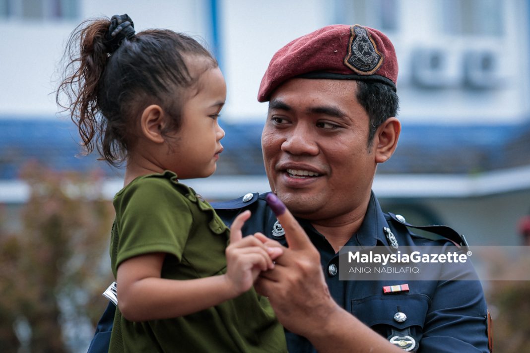 Anggota polis, Muhamad Hairul Shahdan, 35, ditemani anaknya, Nor Aini Syafiqah, 4, selepas menunaikan tanggungjawab mengundi awal sempena Pilihan Raya Kecil (PRK) Dewan Undangan Negeri (DUN) Ayer Kuning di Dewan Rekreasi Pegawai Kanan, Batalion 3 Pasukan Gerakan Am (PGA), Bidor, pada Selasa. Foto ANIQ NABILAFIQ ANUAR, 22 APRIL 2025.