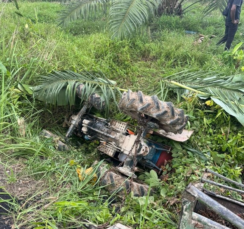 “Setibanya di lokasi kejadian, kita mendapati kemalangan melibatkan sebuah traktor mini yang digunakan untuk mengangkut buah sawit telah terbalik ke dalam parit.