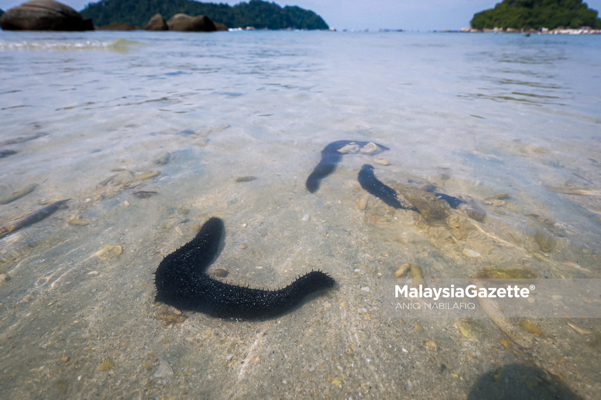 Timun laut kelihatan di dasar laut cetek susulan fenomena air surut di Pantai Teluk Nipah sekali gus mengingatkan pengunjung supaya tidak memijak atau menyentuh hidupan tersebut ketika tinjauan lensa MalaysiaGazette di Pulau Pangkor, pada Isnin. Foto ANIQ NABILAFIQ ANUAR, 02 FEBRUARI 2026.