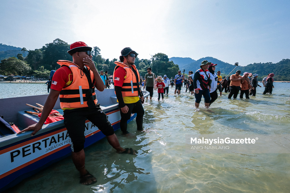 Pelancong tempatan dan asing berjalan kaki menuju ke Pulau Giam dari Pantai Teluk Nipah pada jarak 400 meter ekoran berlaku fenomena air laut surut sehingga menimbulkan beting pasir ketika tinjauan lensa MalaysiaGazette di Pulau Pangkor, pada Isnin. Foto ANIQ NABILAFIQ ANUAR, 02 FEBRUARI 2026.