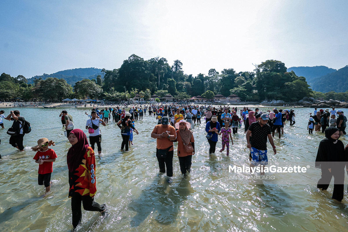 pengunjung jalan di laut terbelah Pulau Pangkor pengalaman laut terbelah Pulau Pangkor, Pantai Teluk Nipah Pangkor, jalan kaki ke Pulau Giam, fenomena alam Pulau Pangkor, pelancong teruja Pangkor, cuti perayaan Pulau Pangkor