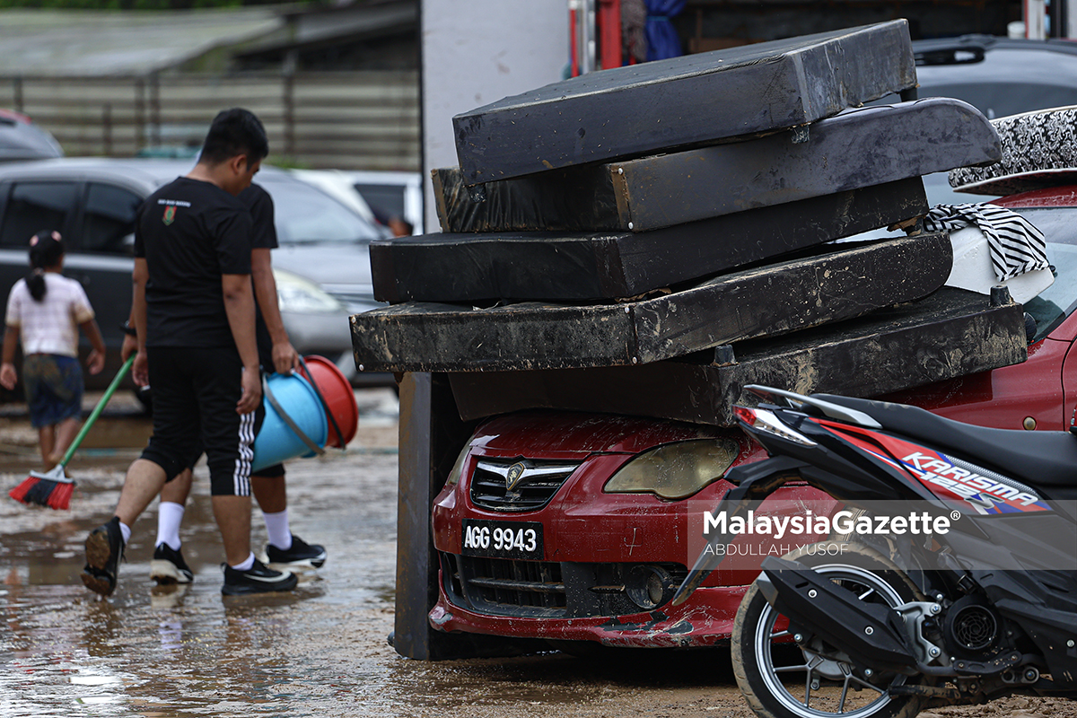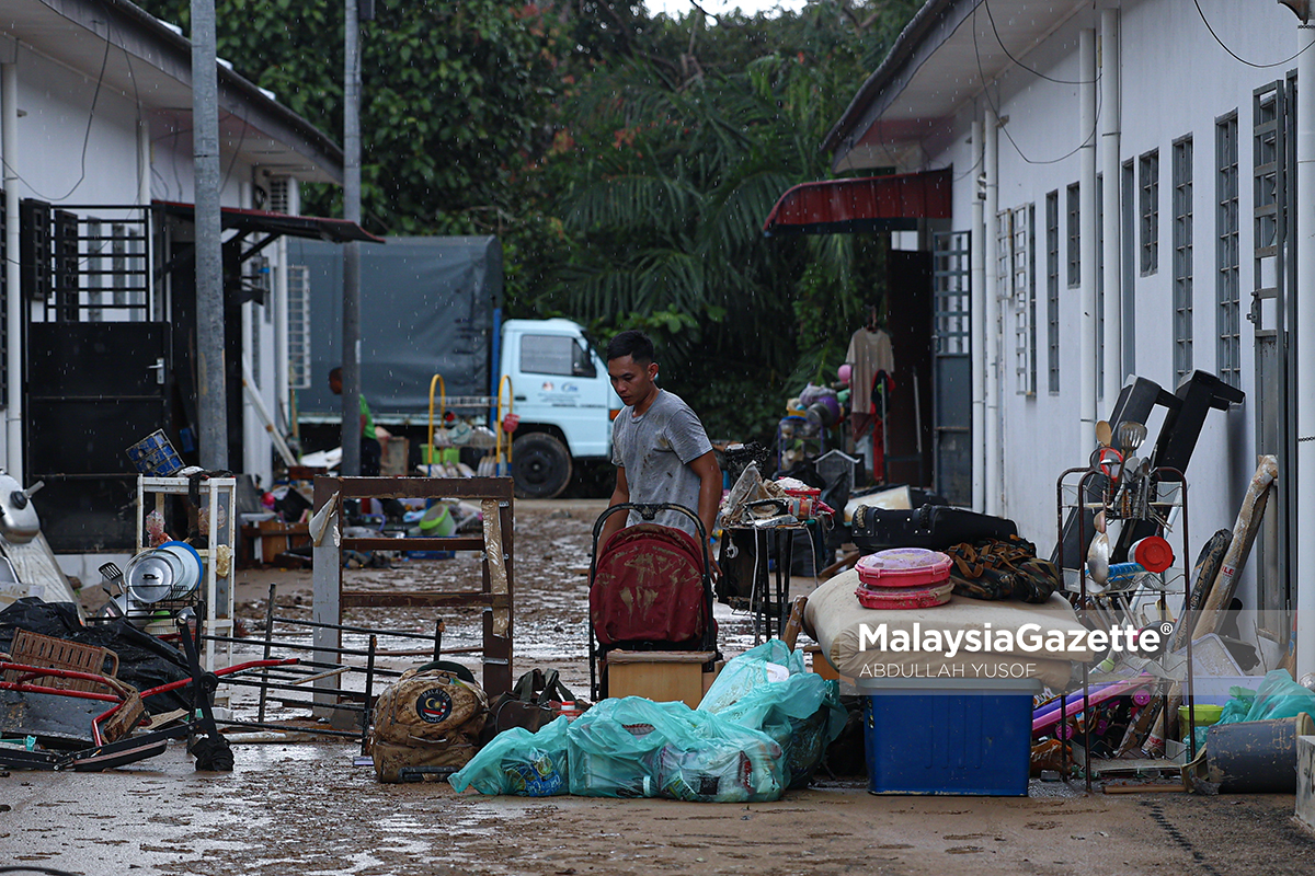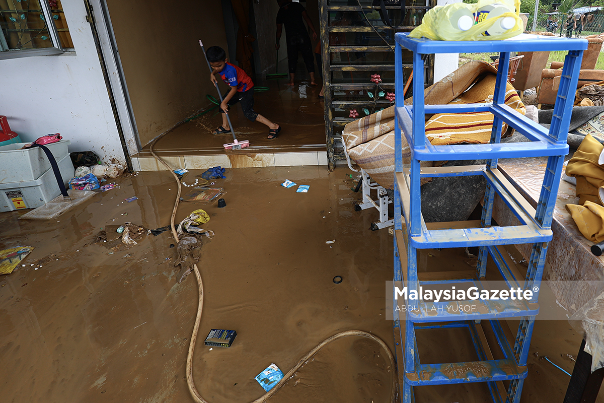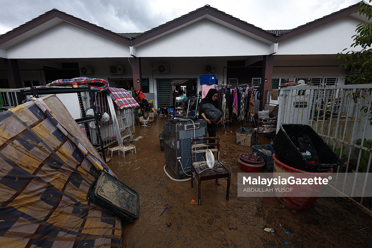 Mangsa banjir giat melakukan kerja-kerja membersihkan rumah masing-masing selepas dilanda banjir kilat sekitar daerah Larut, Matang dan Selama (LMS) di Taman Larah Damai, Kamunting. Foto ABDULLAH YUSOF, 24 OKTOBER 2025.