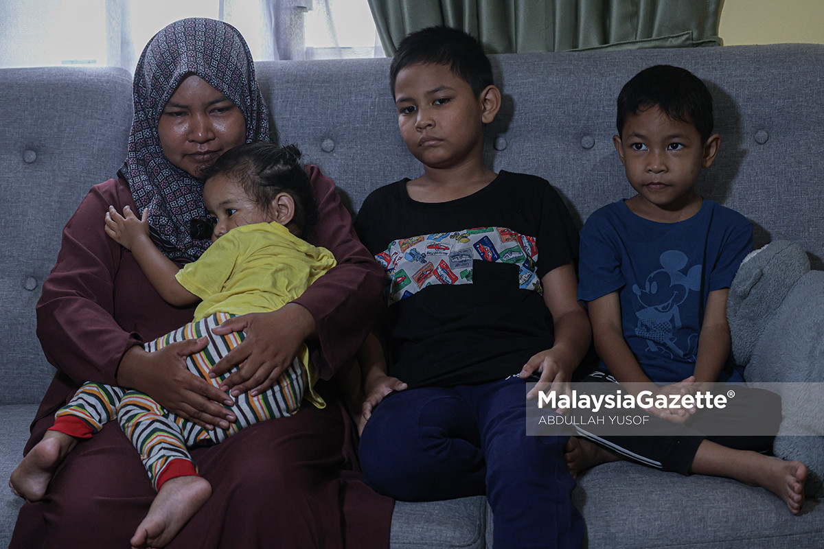 Isteri Allahyarham Amirul Hafiz Omar, Nor Nadia Abdul Majid, 32, bersama tiga anaknya, Muhammad Aqif Amsyar, 9, Muhammad Afif Izz Rayqal, 7 dan Nur Humaira, 2, bersedih ketika ditemui di kediaman keluarga arwah di Kampung Repoh di Batu Kurau, Larut. Foto ABDULLAH YUSOF 30 MARCH 2026.