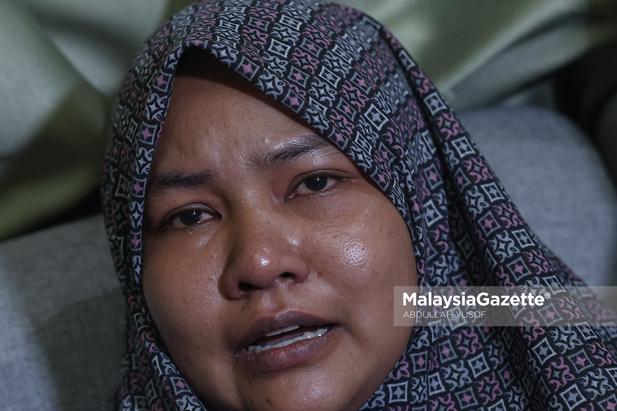 Isteri Allahyarham Amirul Hafiz Omar, Nor Nadia Abdul Majid, 32, sebak ketika ditemui media di kediaman keluarga arwah di Kampung Repoh di Batu Kurau, Larut. Foto ABDULLAH YUSOF 30 MARCH 2026.