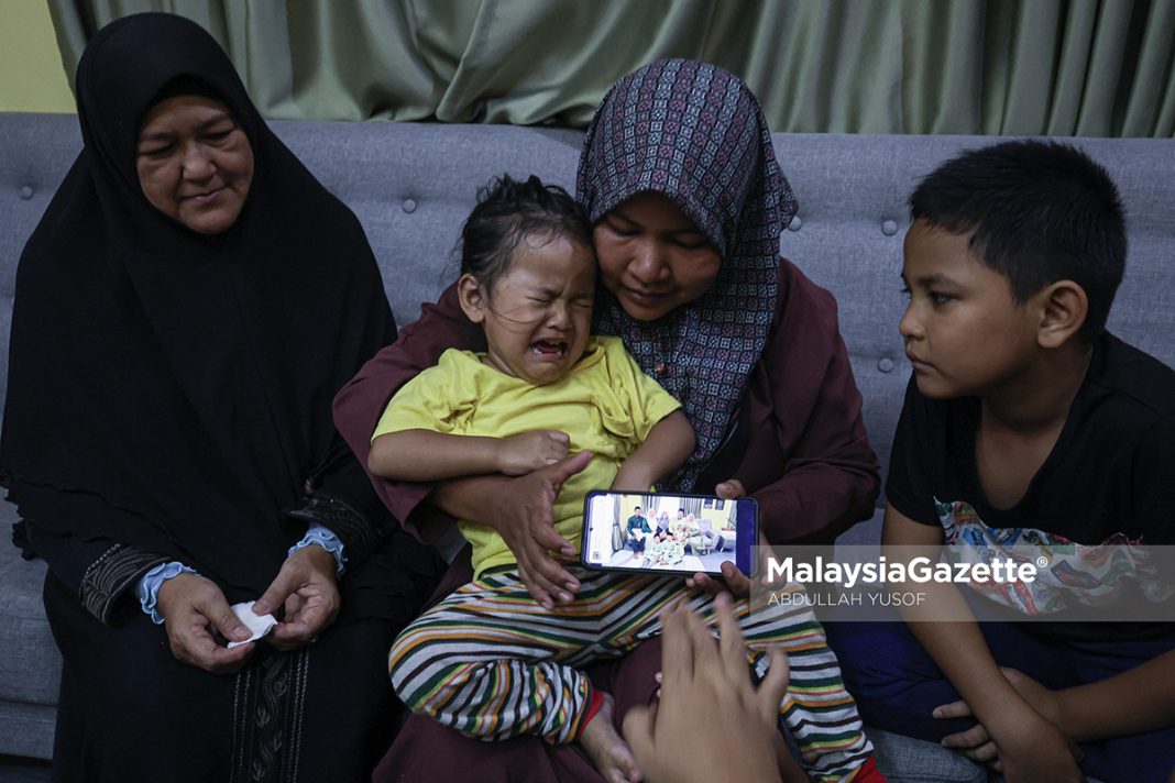 Isteri Allahyarham Amirul Hafiz Omar, Nor Nadia Abdul Majid, 32, bersama tiga anaknya, Muhammad Aqif Amsyar, 9, Muhammad Afif Izz Rayqal, 7 dan Nur Humaira, 2, bersedih ketika ditemui di kediaman keluarga arwah di Kampung Repoh di Batu Kurau, Larut. Foto ABDULLAH YUSOF 30 MARCH 2026.