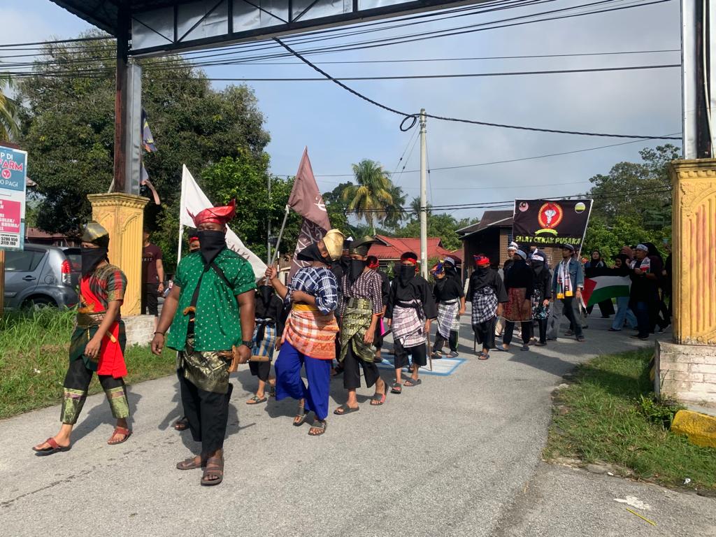 Selain ada yang mengenakan busana tradisional Melayu, para peserta turut berselawat dan berarak dengan membawa bendera Palestin serta plakat yang memaparkan perkataan seperti ‘Selamatkan Gaza’, ‘Doa untuk Palestin’ dan sebagainya.