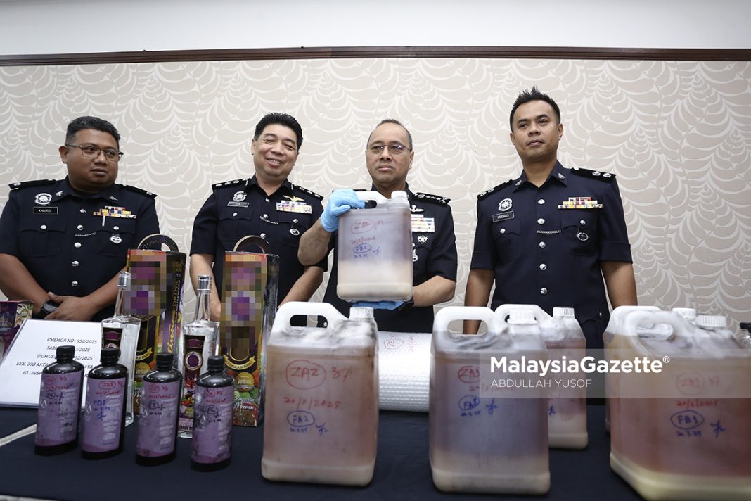 “Polis menemukan dan merampas enam botol plastik dan kaca bertulisan produk minuman kesihatan yang disyaki mengandungi dadah jenis methamphetamine.
