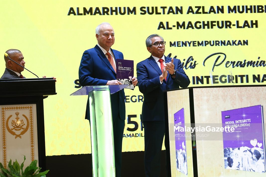 dan Ketua Setiausaha Negara merangkap Pengerusi Institusi Integriti Malaysia (IIM), Tan Sri Shamsul Azri Abu Bakar berucap pada Majlis Sambutan Bulan Integriti Nasional 2025 di Dewan Bankuet, Bangunan Perak Darul Ridzuan, Ipoh pada Rabu. Foto ABDULLAH YUSOF, 05 NOVEMBER 2025