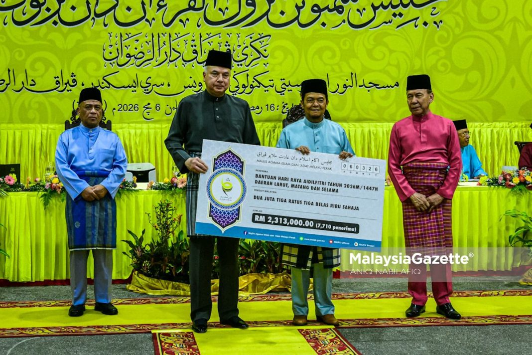 PARIT – Sultan Perak, Sultan Nazrin Muizzuddin Shah, berkenan menyampaikan bantuan Hari Raya Aidilfitri Majlis Agama Islam dan Adat Melayu Perak (MAIPk) bagi tahun 2026 berjumlah RM12.6 juta di pekarangan Masjid An-Nur, Universiti Teknologi Petronas (UTP), Seri Iskandar di sini pada Jumaat.