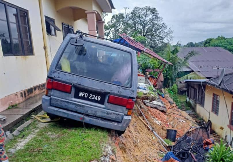 “Setibanya di lokasi mendapati tanah runtuh berlaku di tepi rumah lereng bukit yang berkeluasan kira-kira 10×80 kaki persegi.