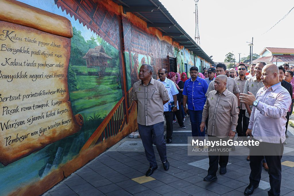 Menteri Besar Perak, Datuk Seri Saarani Mohamad melihat lukisan mural pada Majlis Perasmian Dataran Gangga Negara, Beruas. Foto ABDULLAH YUSOF.